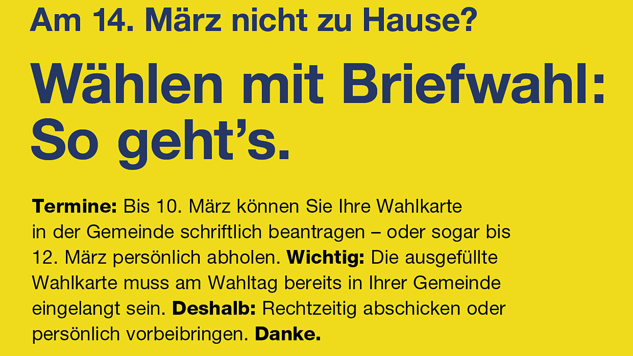 Wahlkarten für nicht gehfähige oder bettlägerige Personen können bis drei Tage vor der Wahl beim Gemeindeamt Wahlkarten beantragt werden.