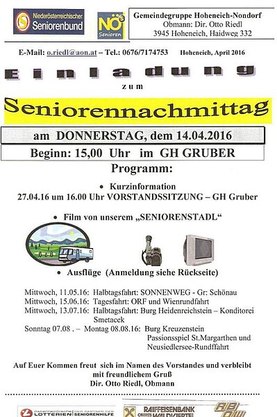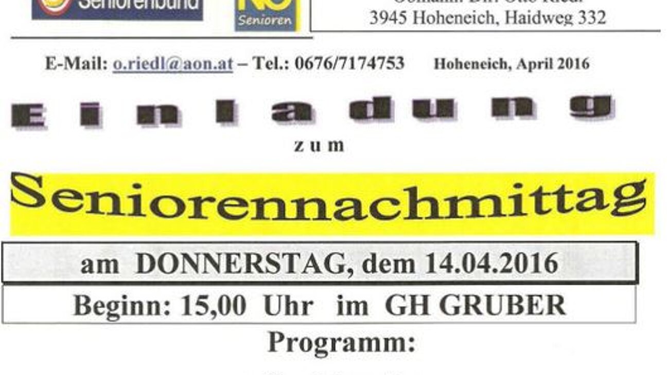 Der nächste Seniorentreff des Seniorenbundes Hoheneich findet am 14. April 2016 (Donnerstag) ab 15,00 Uhr im Gasthaus Gruber in Hoheneich statt. Neben Kurzinformationen durch unseren Obmann Otto Riedl über geplante Ausflüge wird ein Film über die heurige Faschingsveranstaltung (Seniorenstadl) gezeigt. Wir freuen uns über Ihren Besuch und bringen Sie bitte auch Freunde und Bekannte mit. weitere Bilder: